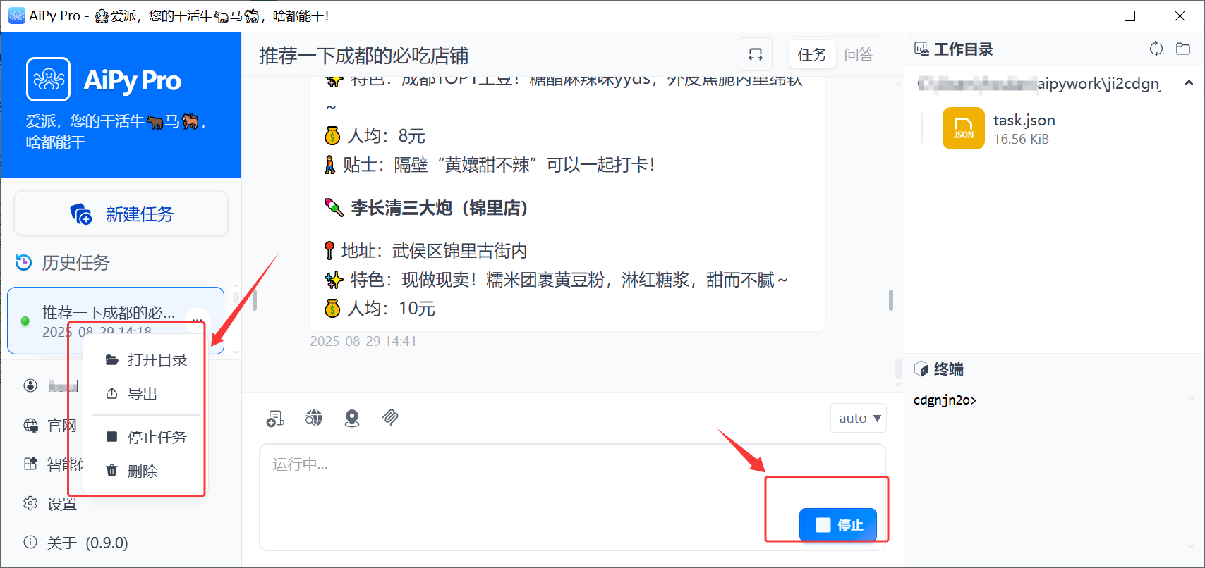奔跑的小明 功能解析: 1、右下角的终止按纽,只是暂停会话,暂停后,仍然可以继续追问,对当前问题继续回答。 2、左上角点开问题后面的“...”,可展开停止任务按纽,该功能为彻底停止该任务,停止后,将无法继续追问。 3、左侧任务列表中,前面有绿点的,代表仍然可以追问,灰点代表已彻底停止不可追问。