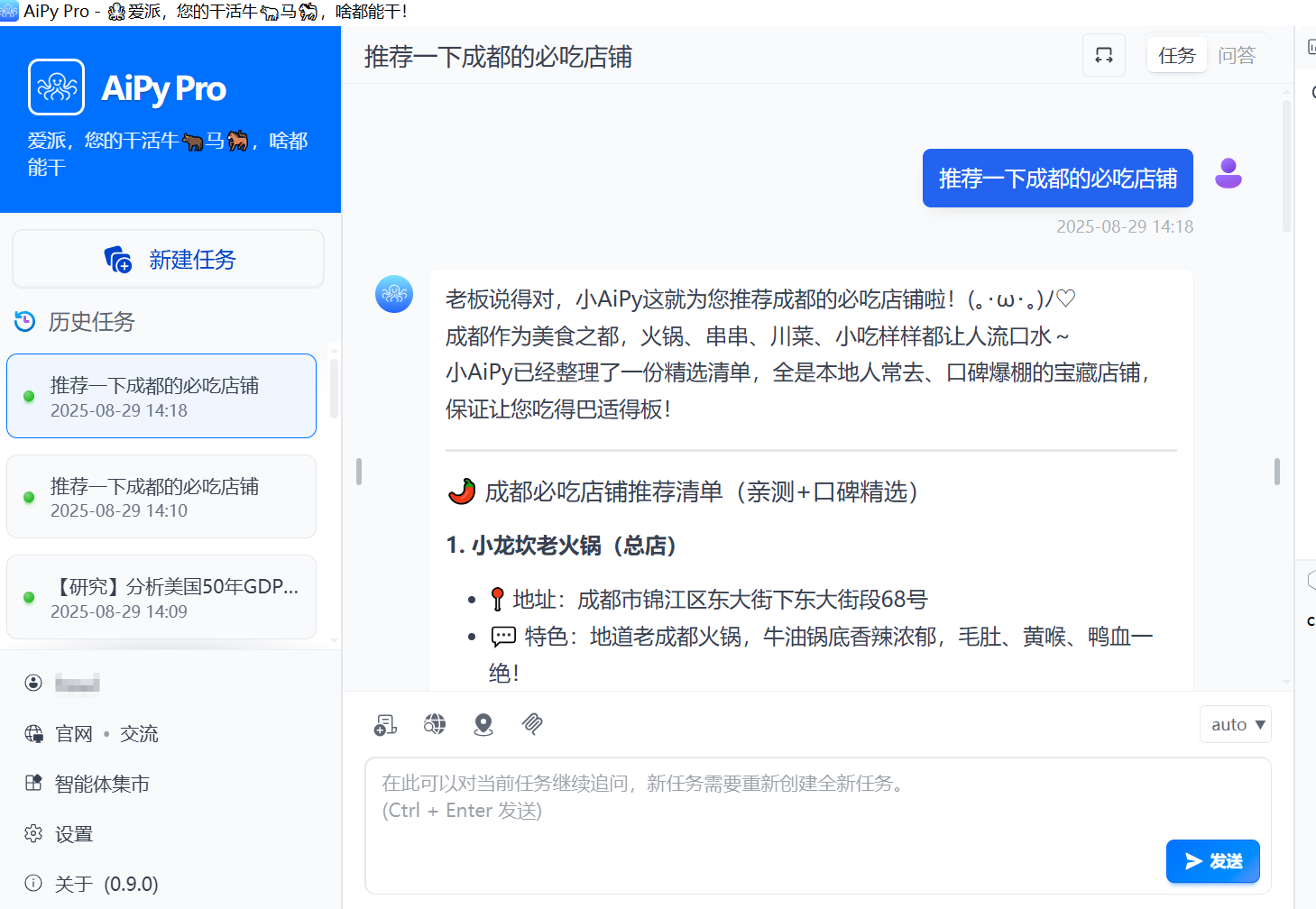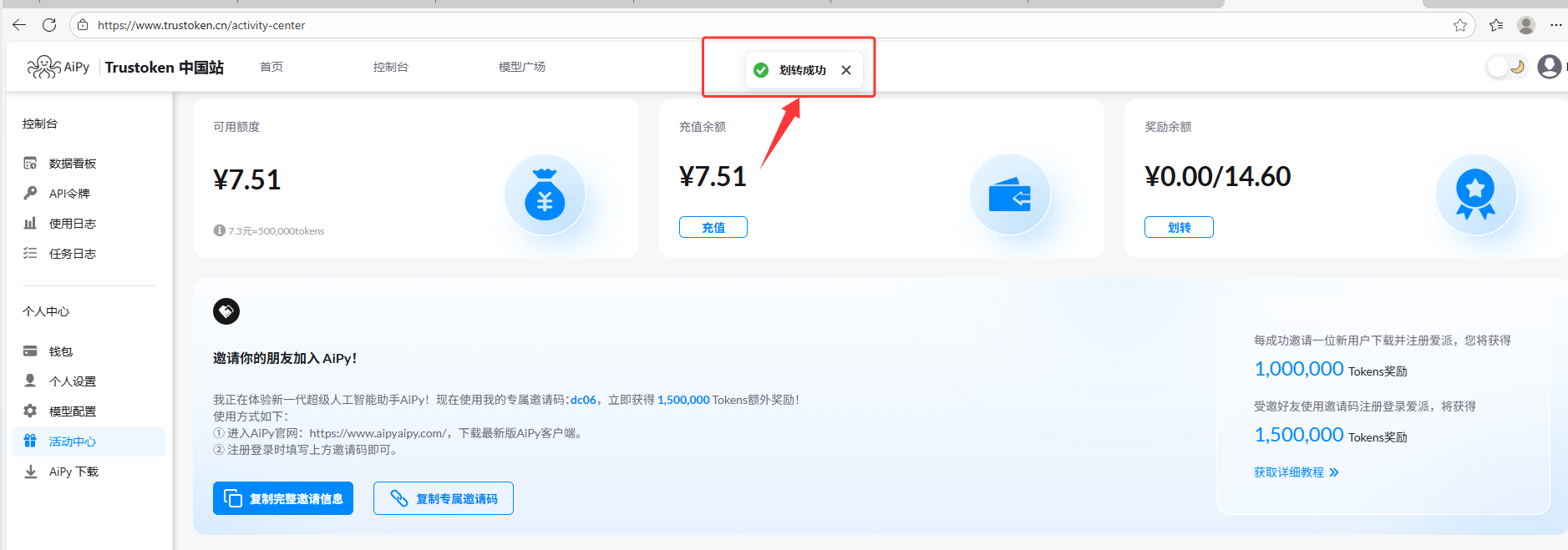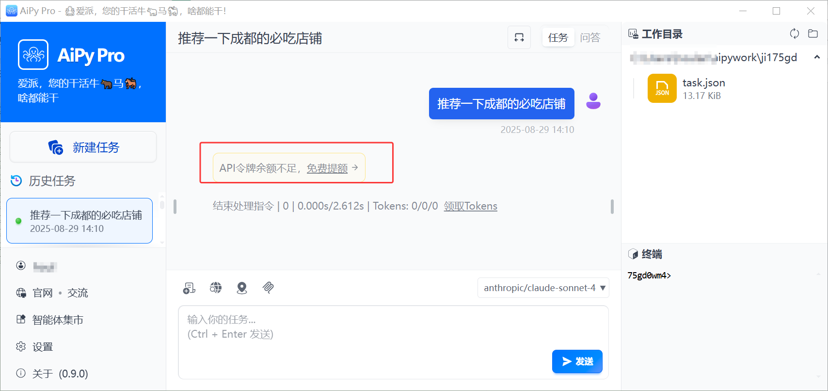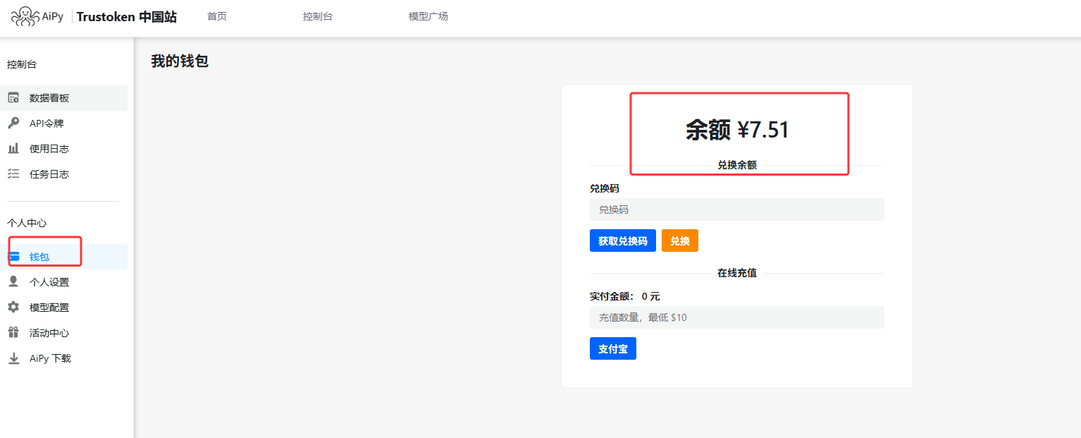 操作后,去钱包中查看,余额增加了,并且新开任务,AiPy中可以正常提问了: