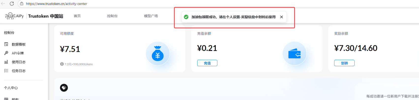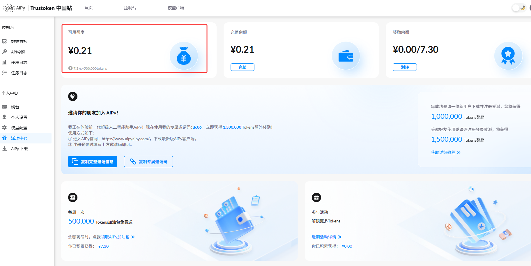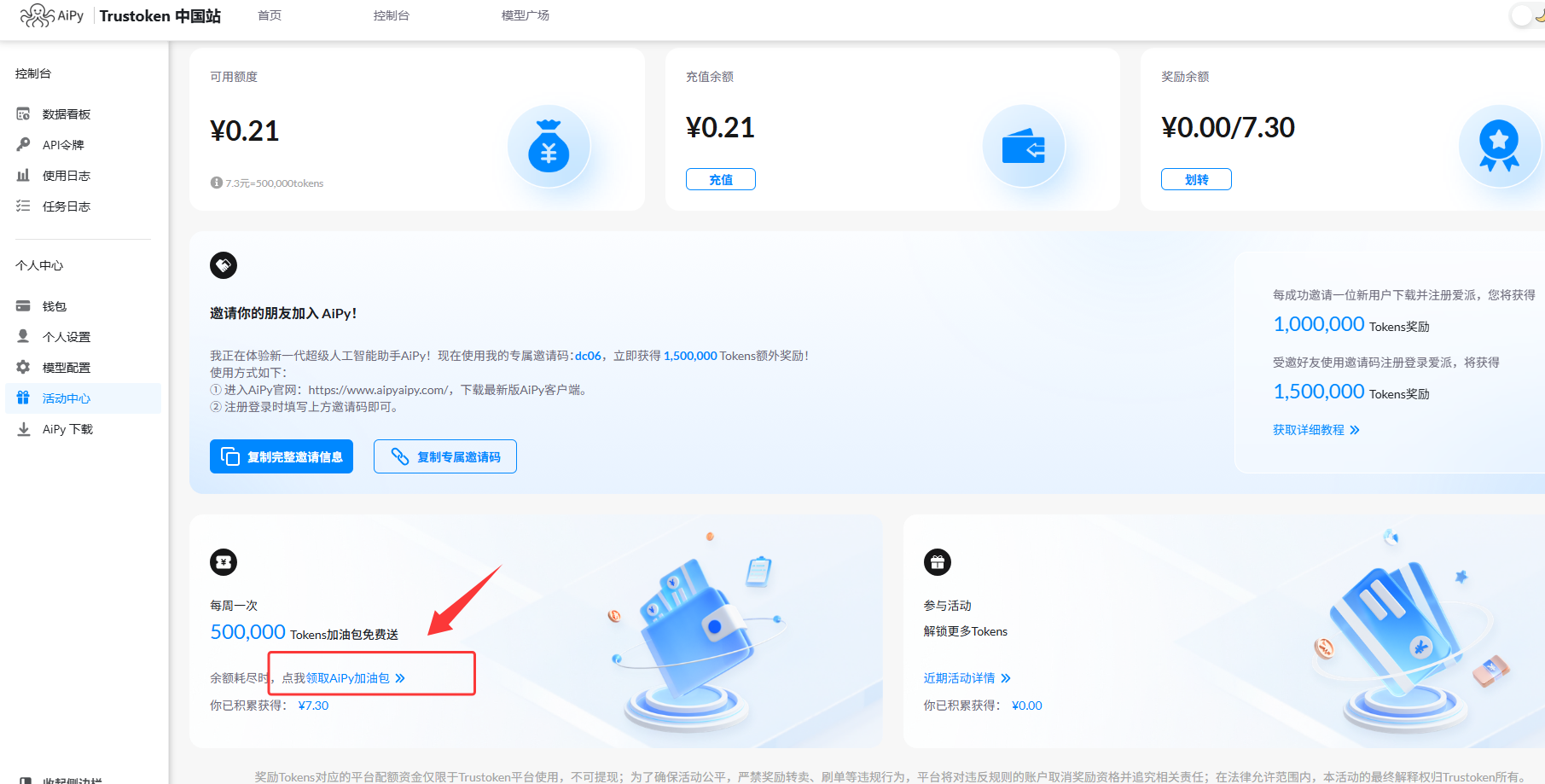 发现确实余额不足了,只剩下2毛1,于是点击“领取AiPy加油包”