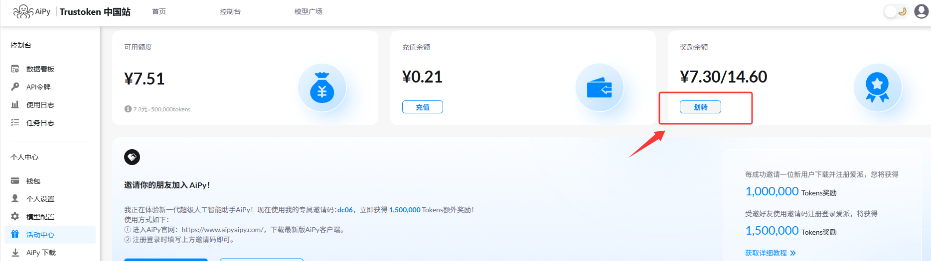根据提示,需要至奖励余额中进行划转操作,于是进行操作: