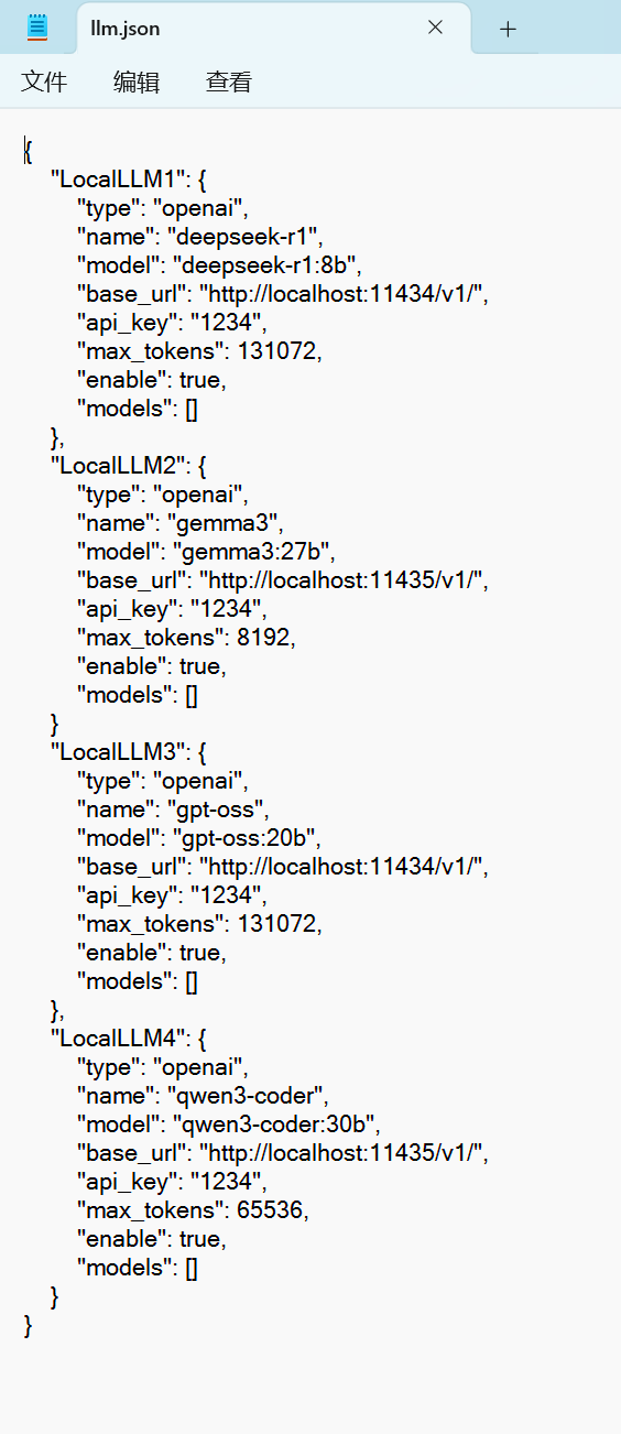 在llm.json中写入下面的内容,注意里面的内容根据你的实际情况修改,据说如果没有密码的话api_key可以随便写,主要改base_url、model的值: