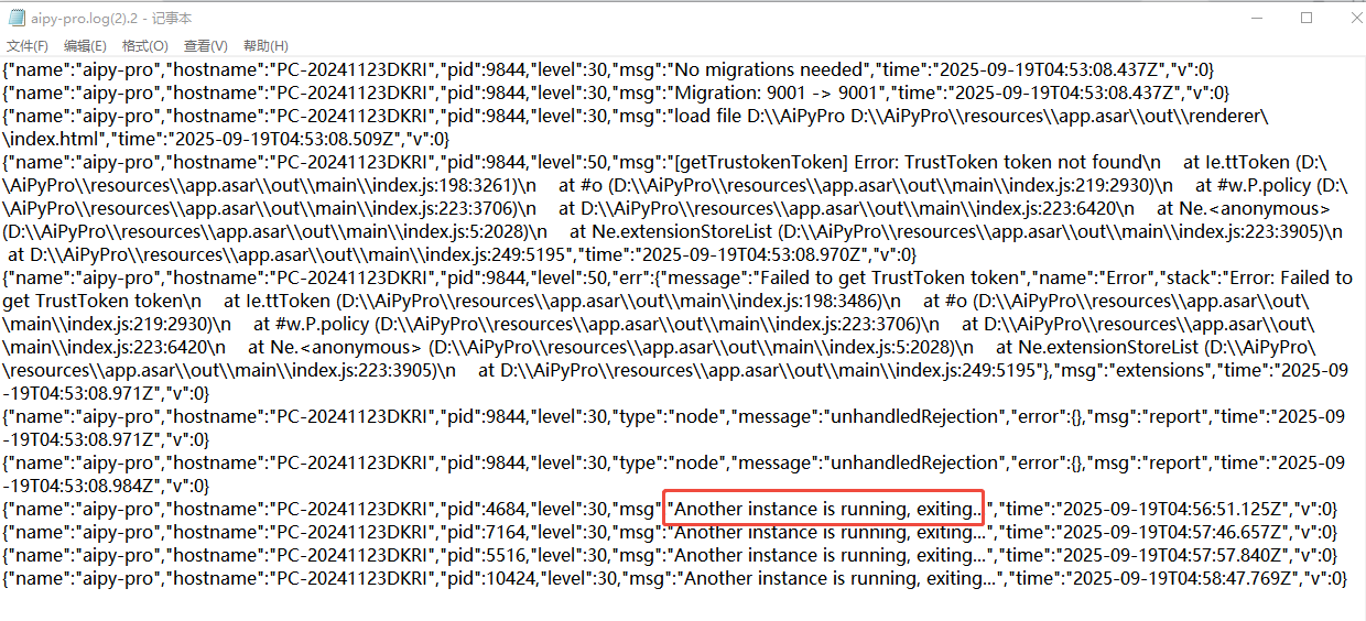 这是因为之前已经启动了AiPy进程没有正常退出,可以在进程管理器中找到aipy进程杀掉重来。