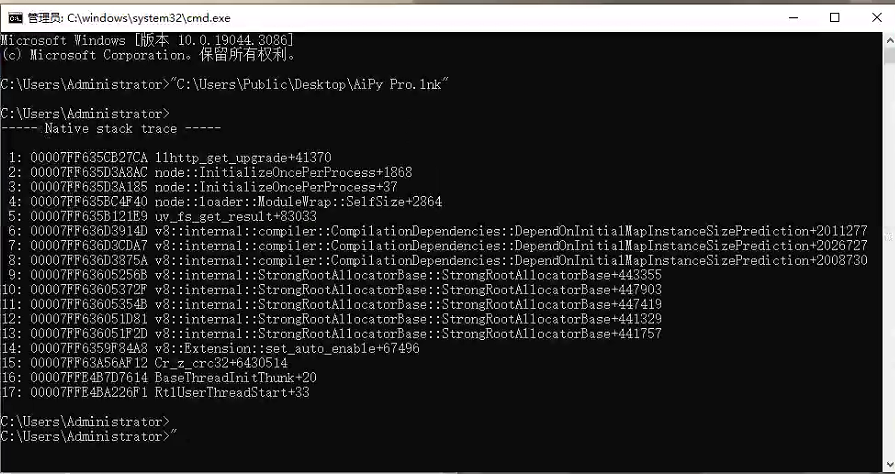 步骤3:如果以上情况未解决,将AiPy Pro.exe拖到cmd中运行查看报错,若出现Native stack trace。在cmd执行命令echo 123 > nul会返回`系统找不到指定文件。这是Windows 平台上禁用空设备的问题,暂时还没有其他解决办法。参考:https://github.com/electron/electron/issues/44881;https://github.com/electron/electron/issues/44881。