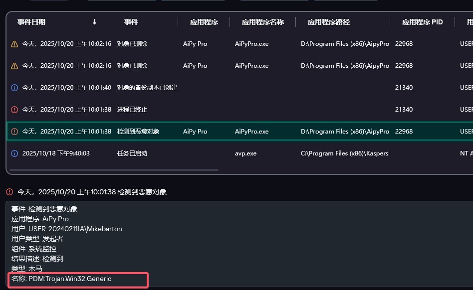 AiPy Pro给卡巴斯基识别为木马病毒?